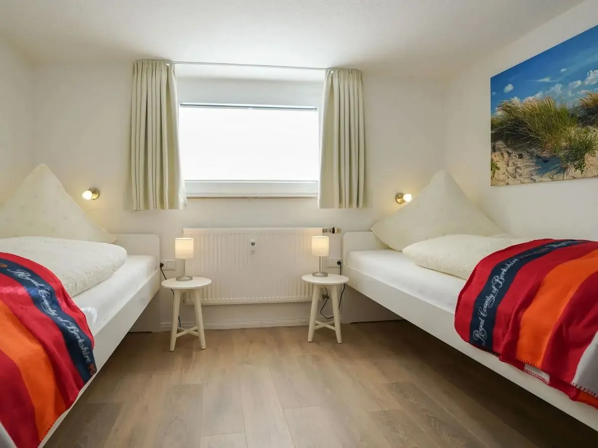 Ein Schlafzimmer mit Doppelbett und Kleiderschrank. Ein weiteres Schlafzimmer mit zwei Einzelbetten.