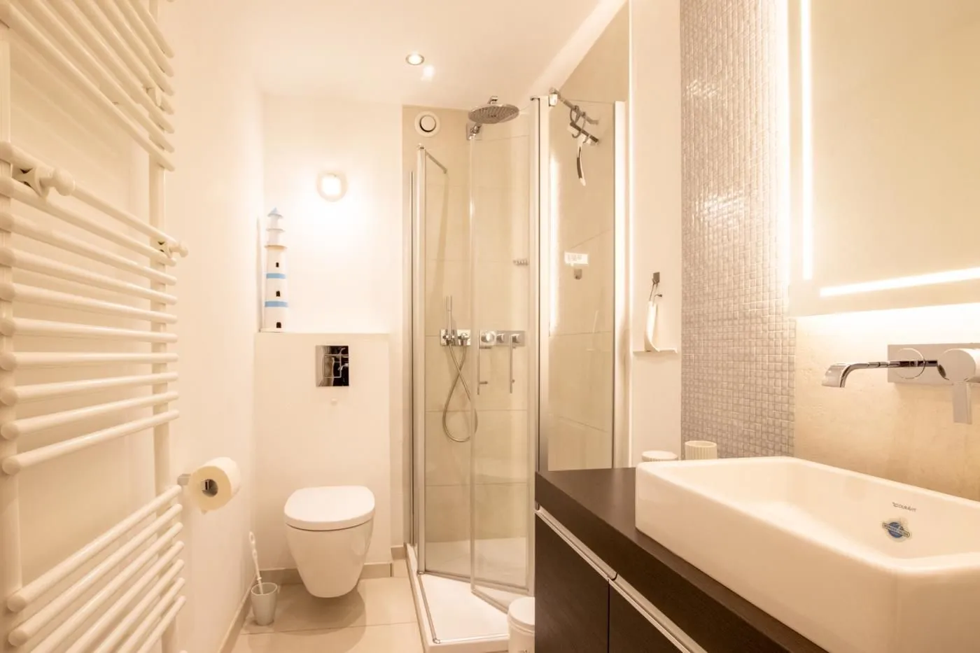 Modernes Bad mit Dusche, WC, Waschtisch und Handtuchheizung.