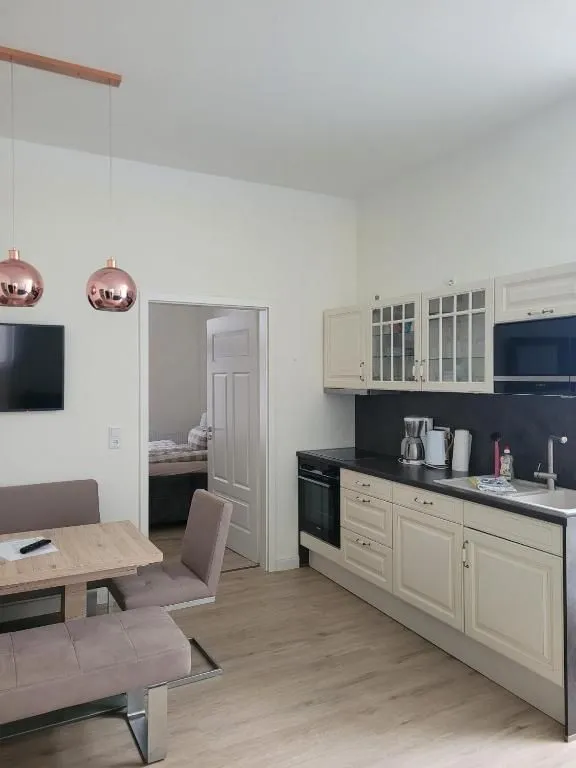 Die Unterkunft befindet sich im Parterre der Villa Sofia und eignet sich ideal für Paare oder Familien, da sie Platz für bis zu vier Personen bietet. Das separate Schlafzimmer ist behaglich eingerichtet, sodass Sie erholsame Nächte in ruhiger Atmosphäre genießen können. Der kombinierte Wohn- und Essbereich ist offen gestaltet und lädt zum Entspannen und geselligen Beisammensein ein. Ein Esstisch sowie ein komfortabler Sitzbereich sind vorhanden, wodurch gemeinsames Frühstücken oder entspannte Abende in angenehmer Umgebung möglich werden.