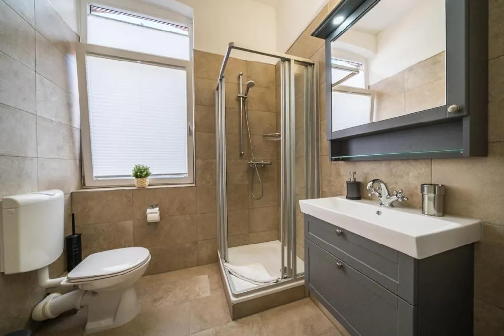 Das Badezimmer der Villa Sofia bietet eine Dusche, ein WC sowie ein Waschbecken. Ein Kosmetikspiegel und ein großer Spiegel stehen Ihnen für die tägliche Pflege zur Verfügung. Für ein wohltuendes Ambiente sorgen sowohl praktische als auch dekorative Details, sodass Sie sich ab dem ersten Moment wohlfühlen. Rauchmelder sind installiert und unterstützen so die Sicherheit während Ihres Aufenthalts.